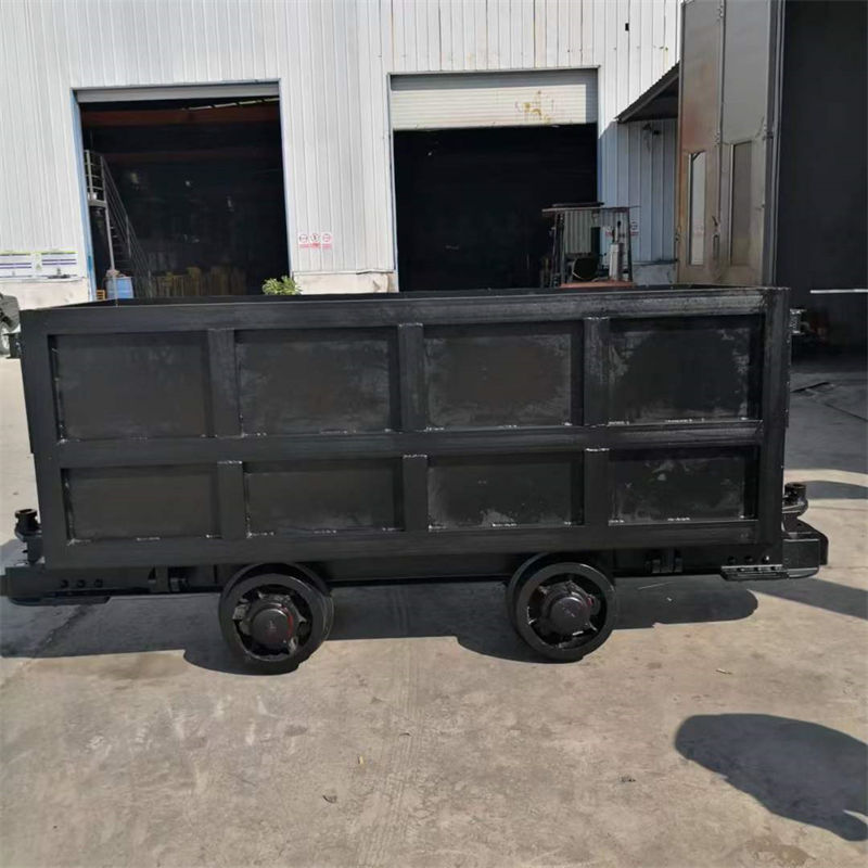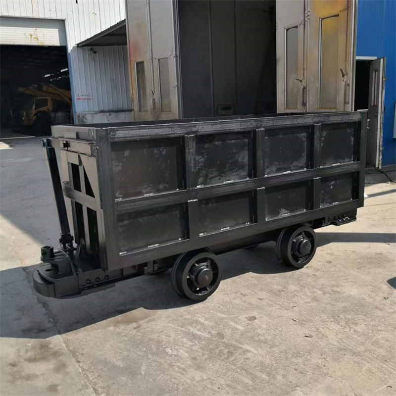 侧卸式矿车主要适用于冶金、矿山、煤矿、铁路、公路遂道、水下涵洞、地下矿平巷和军事涵洞等工程掘进、施工、配套简单、高效率出渣运输设备。侧卸式矿车由牵引车、绞车带动,可与凿岩钻、立爪装岩机和矿石溜开闸门放料系统配套结合装料,矿石块度不超过600毫米,根据矿车的负载容积,装料后经牵引动力引至(运行速度不超过1m/秒)专用曲轨卸料器。当车箱翻至水平成最大卸料角度时,车门也开到最大程序。这时矿车卸料以全部完成。返回时,矿车通过曲轨门又自动关闭到位。